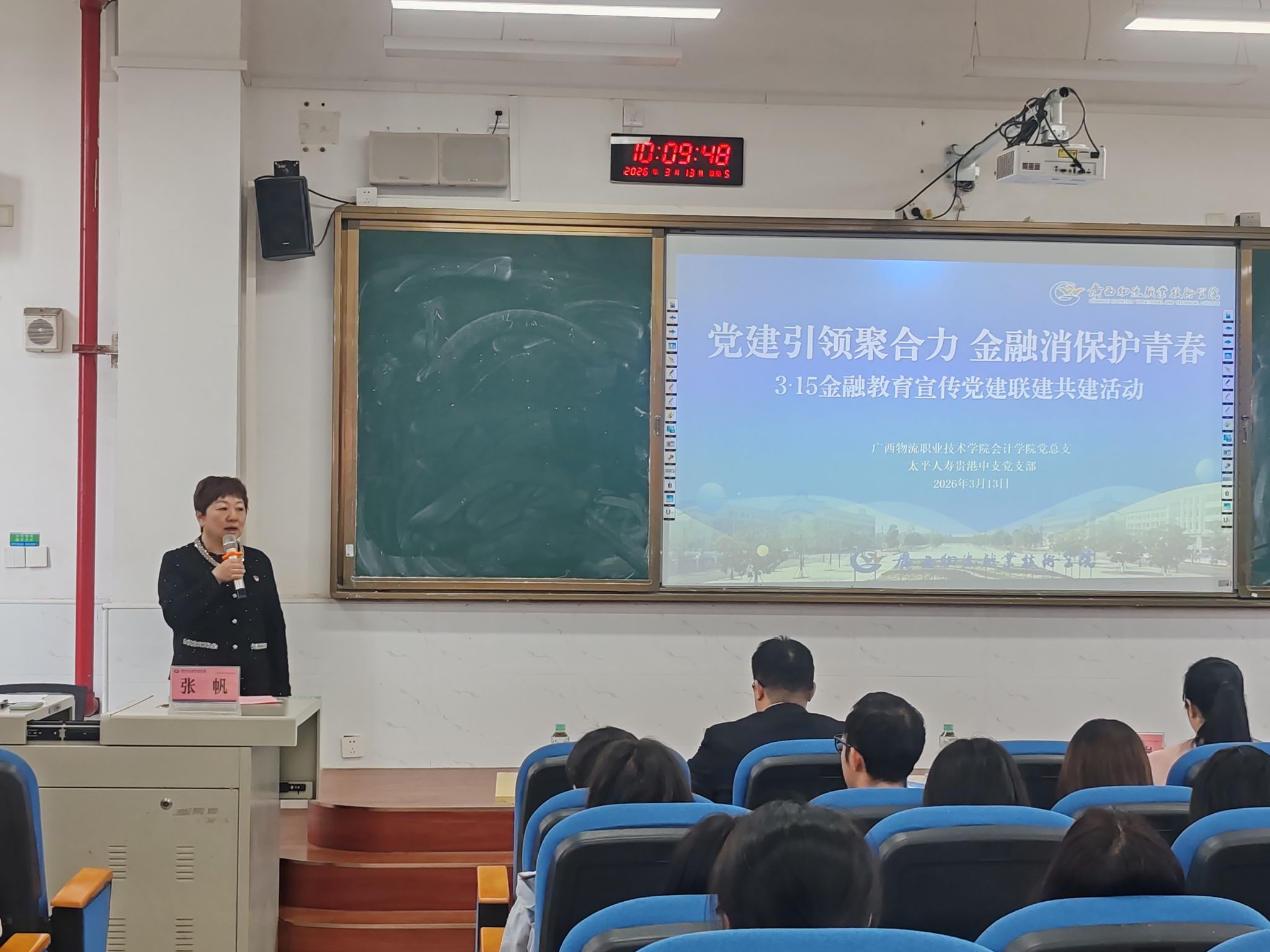 为提升广大师生金融素养与反诈防骗能力、筑牢校园消费安全防线,在第44个“3·15”国际消费者权益日到来之际,广西物流职业技术学院会计学院党总支联合太平人寿贵港中支党支部,举办“党建引领聚合力·金融消保护青春” 3・15 金融教育宣传党建联建共建活动暨“学习雷锋精神·争当时代先锋”反诈防诈主题志愿活动。会计学院党员教师、学生代表共60余人参与。