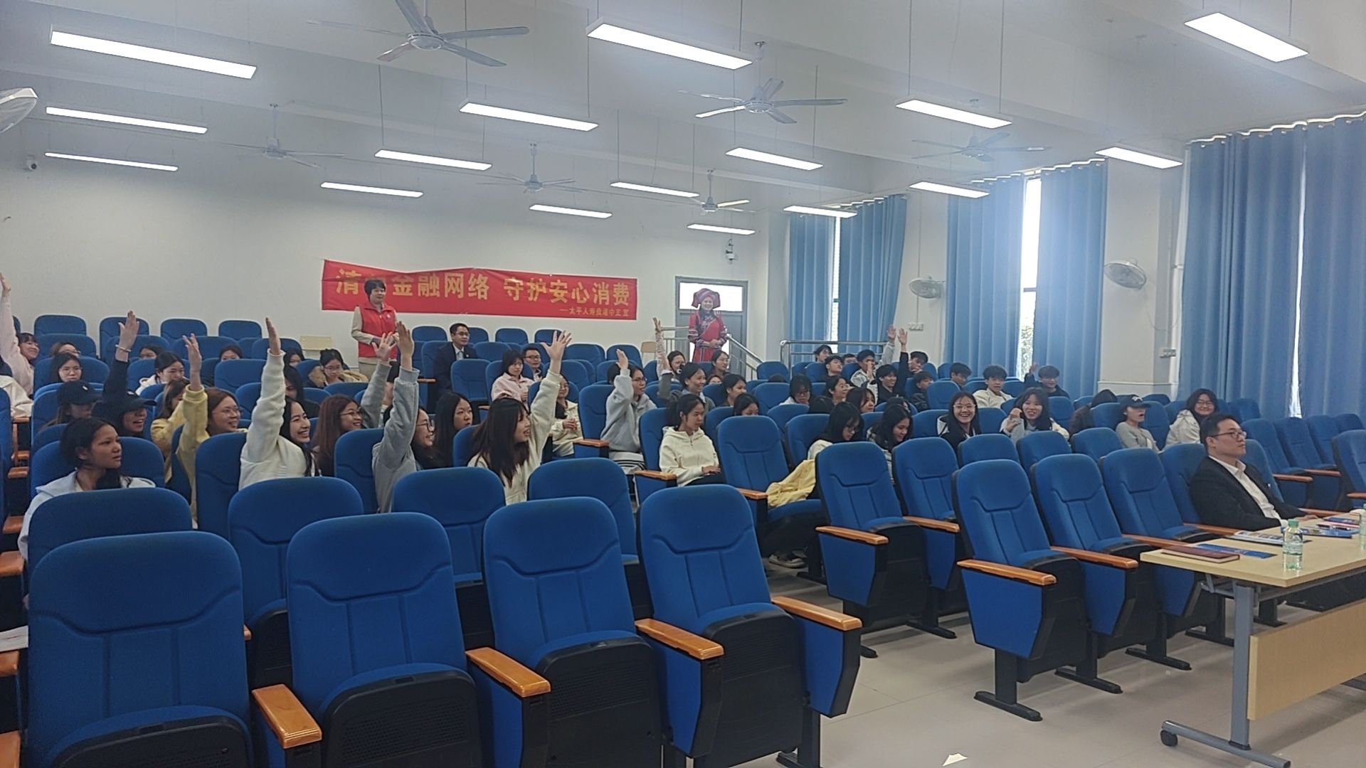 宣讲会上,太平人寿贵港中支的庾晓巍经理围绕金融消费者八大权益等专业知识,结合校园电信诈骗、虚假网贷、刷单返利等典型案例,用通俗易懂的语言讲解反诈防骗技巧,引导师生树立理性消费观念,守护个人信息安全。同时,通过有奖问答互动,师生们对金融消费者权益保护有了更加全面深入的认识。
